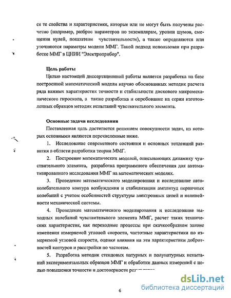Целью настоящей диссертационной работы является разработка на базе построенной математической модели научно обоснованных методик расчета ряда важных характеристик точности и стабильности дискового микромеханического гироскопа, а также разработка и опробование на серии изготовленных образцов методик испытаний чувствительного элемента.