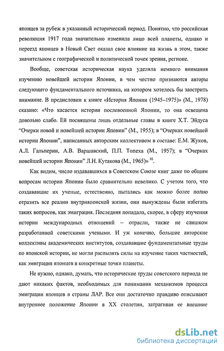 рова сравнительно мало привлекала внимание отечественных исследователей Пожалуй, только в работах В О Кистанова [Кистанов В О Экономическое проникновение Японии в Латинскую Америку М, «Наука», 1982] тщательно изучен средний (1951-1980-е гг) ее этап, особенно экономический аспект развития японской диаспоры в латиноамериканском регионе Краткую характеристику первого этапа японской иммиграции на территорию интересующих нас государств дает также Д В Петров [Петров Д В Внешняя политика Японии М, «Наука», 1978] Две этих работы внесли существенный вклад в понимание движущих сил и специфики массового переселения граждан Японии в Канаду, страны ЛАР и на Гавайи
