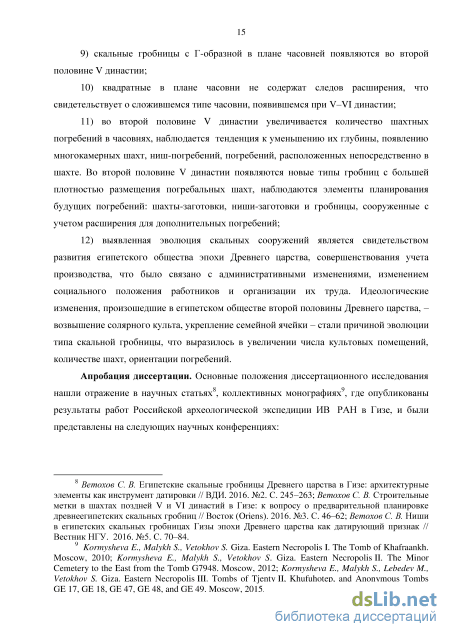 гробничных сооружений, опубликованных в научной литературе, но имеющих широкую датировку, например, относящей сооружение гробницы к периоду V– VI династия, или вовсе оставленных без датировки. Автор диссертации с 2000 года является постоянным участником данной экспедиции, что позволило не только непосредственно получить использованный в диссертации материал, но и провести на месте сравнение полученных данных с другими гробницами Гизы, выявить аналогии и особенности исследуемых сооружений.