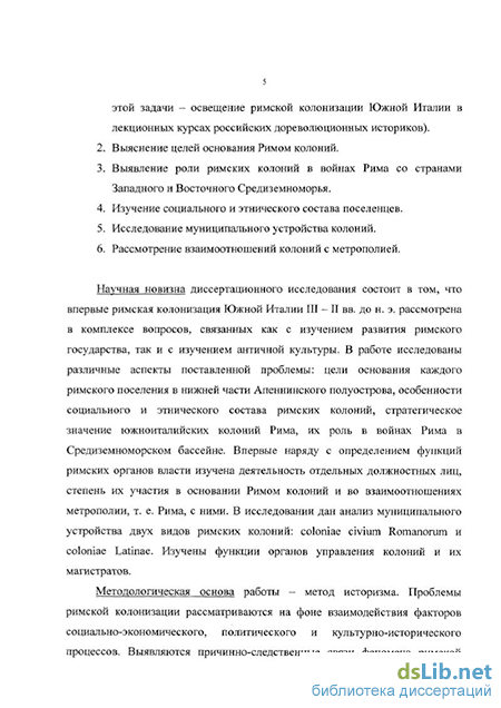 Б. А. Павлович в работе «История Греции и Рима» чётко выделил две главные цели римской колонизации эпохе республики - военную (для охраны римских приобретений в завоёванных областях Италии) и аграрно-социальную (удаление из Рима беднейших граждан с наделением из участками земли в основываемых поселениях).347 Кроме того, Павлович подчеркнул связь колонизации со строительством дорог. Касаясь южного направления римской колонизации, учёный высказал соображение о том, что основание римлянами колоний в Капании и Лукании в кон. IV - начале III вв. до н. э. преследовало стратегические цели.349 Однако для Павловича характерно несколько прямолинейная характеристика некоторых аспектов освоения римлянами Южной Италии. Так, говоря о взаимоотношениях колоний и метрополии, Павлович считал, что поселения латинского права «не могли не отличаться преданностью Риму», поскольку находились «в чужой стране» во враждебном окружении. Учёный также преувеличивал масштабы римской колонизации Самния в начале III в. до н. э., говоря, что там было основано «много римских и латинских колоний».351