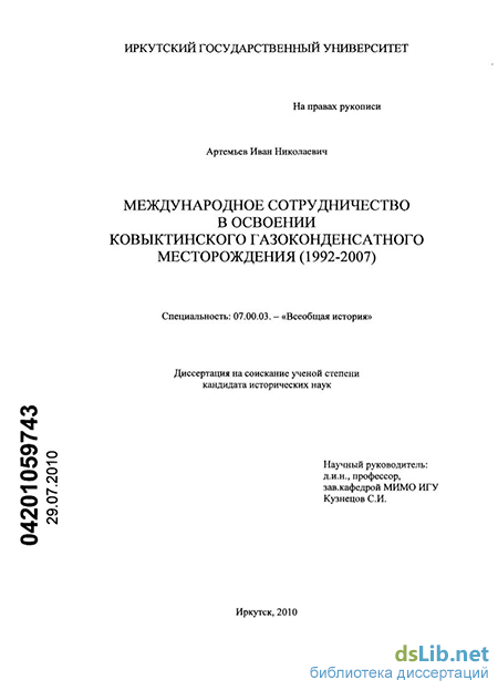 Хронологические рамки исследования охватывают период с апреля 1992 г. по июнь 2007 г. Нижняя хронологическая граница обусловлена датой создания компании-оператора Ковыктинского месторождения – ОАО Компания «РУСИА Петролеум». Верхняя граница – завершение логического периода возможного участия иностранных инвесторов в освоении КГКМ, выразившееся в намерении российского государства полностью вернуть себе контроль над проектом.