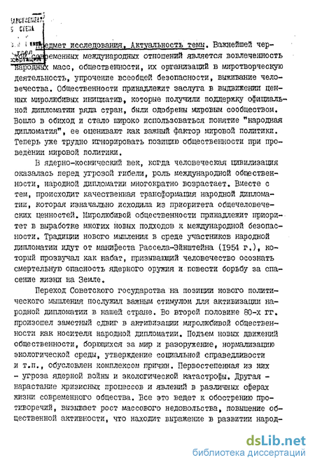 Таким образом, предметом исследования в данной работе является анализ роли миролюбивой общественности, народной дипломатии в международных отношениях, в выживании человечества. При этом первостепенное внимание уделяется выяснению того, как новое мышление утверждается в деятельности общественных органи заций, прежде всего нашей страны. Автор не претендует, да это и не под силу одному л с следователю, на раскрытие деятельности всемирного общественного движения народной дипломатии. В рамках данной работы ставится более узкая задача анализа наиболее общих тенденций в развитии народной дипломатии, прежде всего на примере основных международных и советских общественных организаций,как части широких международных общественных сил.