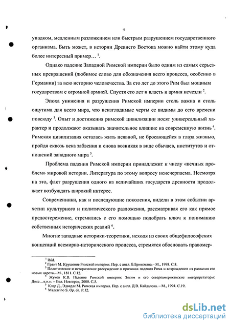 Состояние научной разработанности проблемы. За длительный период изучения падения Римской империи как особого исторического феномена наука накопила значительный материал. В изучении историографии падения Римской империи имеются несомненные традиции и достижения, выработаны подходы, сложились целые направления; на сегодняшний день это огромный массив литературы, едва ли обозримый в одной работе. Наличие многочисленных основательных обобщений не исключает, однако, применения в некоторых из них формальных и во многом упрощенных схем. Кроме того, анализ историографической традиции убеждает в том, что и до настоящего времени остается малоисследованным и дискуссионным целый ряд вопросов. В этой связи считаем необходимым указать на труды отечественных и зарубежных исследователей, в которых разбирались темы и аспекты, получившие особую актуальность.