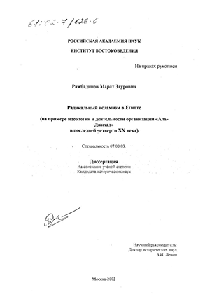 Ражбадинов Марат Заурович. Радикальный исламизм в Египте : На примере идеологии и деятельности организации "Аль-Джихад" в последней четверти XX века : диссертация ... кандидата исторических наук : 07.00.03.- Москва, 2002.- 194 с.: ил. РГБ ОД, 61 02-7/626-5