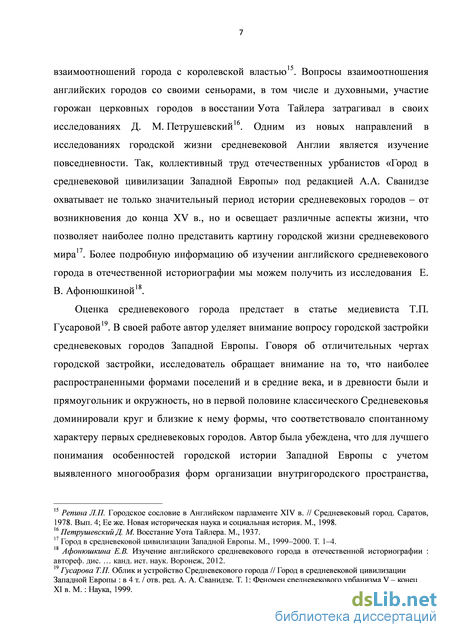На протяжении всего XX в. в отечественных исследованиях возрастал интерес к изучению феномена европейского города эпохи Средневековья и раннего Нового времени, включая проблемы коммунального хозяйства и благоустройства. Работы отечественных ученых по истории английского города можно разделить на две группы. Первая группа исследований посвящена истории английских средневековых городов XI–XV вв. Эти труды, подробно исследованные Е. В. Афонюшкиной, интересны нам методологией и фактическим материалом по различным аспектам жизни средневекового английского города, но тема коммунального хозяйства нашла в них лишь частичное отражение. В работах А. Л. Ястребицкой освещаются сюжеты, связанные с вопросами регулирования городских застроек, санитарного состояния и пожарной безопасности городов Западной Европы раннего средневековья. Проблема городского планирования в средневековых городах рассматривалась в статьях Т. П. Гусаровой. Систему коммуникаций средневекового города Западной Европы изучал А. Я. Шевеленко.