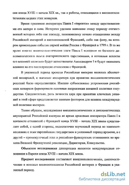 Время правления императора Павла I «теряется» между царствованиями его матери и сына. Историки уделяли внимание этому периоду отечественной истории либо как эпизоду, положившему начало отношениям между Российской империей и наполеоновской Францией, либо как фону, на котором происходили события первой войны России с Францией в 1799 г. В то же ирс-мя многие шіеігшеполи гические шаги TTaujia I исходили из богатого дипломатического опьпа екатерининского царствования, а основные аспекты его внешней политики будут заимствованы Александром Т и будут оказывать влияние на его последующие отношения с Францией.