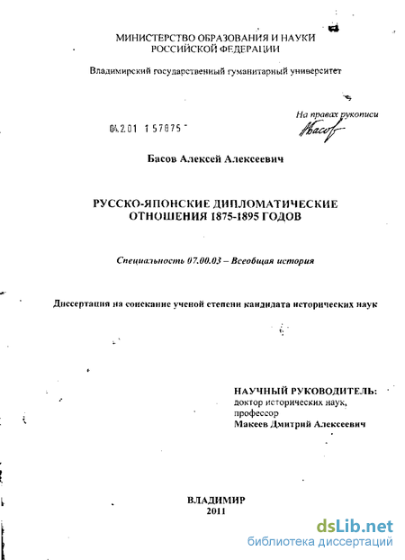 Цель диссертационной работы - исследование динамики и особенностей дипломатических отношений между Россией и Японией в период после заключения Петербургского договора (1875 г.) до подписания русско-японского договора о торговле и мореплавании (1895 г.).