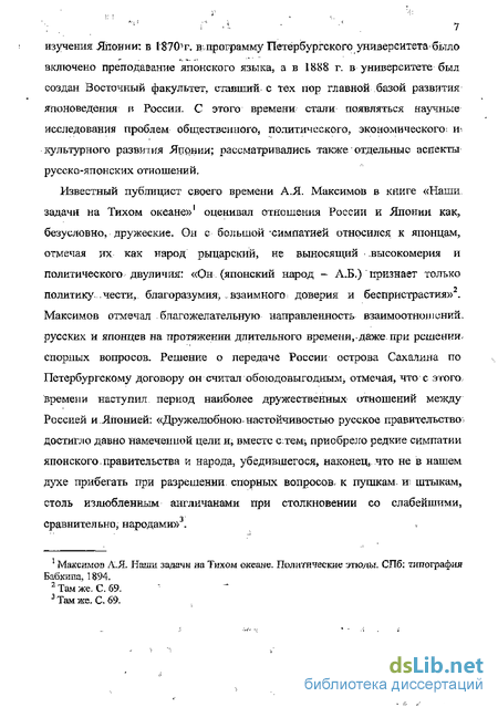 Известный публицист своего времени А.Я. Максимов в книге «Наши задачи на Тихом океане»1 оценивал отношения России и Японии как, безусловно, дружеские. Он с большой симпатией относился к японцам, характеризуя их как народ рыцарский, не выносящий высокомерия и политического двуличия. Максимов отмечал благожелательную направленность взаимоотношений русских и японцев на протяжении длительного времени, даже при решении спорных вопросов.