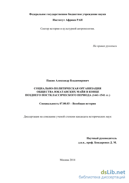 3). На основе анализа социально-политической структуры общества дано определение общества поздних постклассических майя в рамках существующих неоэволюционистских моделей организации общества. Этот вывод представляется актуальным на фоне укоренившейся в последнее время среди исследователей постклассического общества майя тенденции избегать таких определений и использовать вместо этого автохтонную терминологию. Политии Северного Юкатана, называемые самими майя кучкабаль, которые ранее оценивались исследователями как вождества (Д. Маркус) или, в отечественной историографии, номовые государства (В. И. Гуляев), на самом деле являются сложными вожде-ствами.