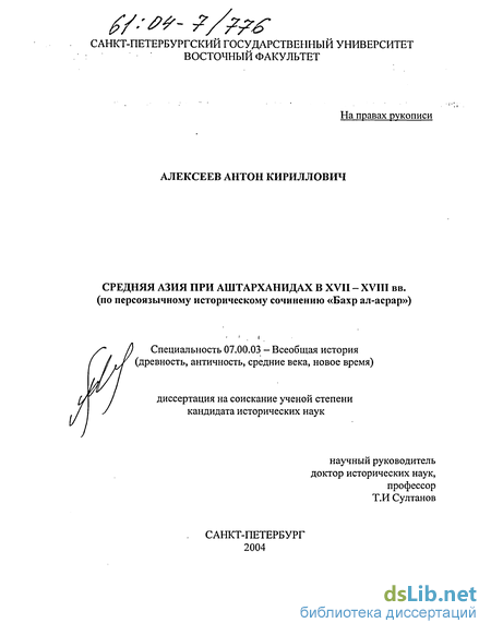 Степень разработанности проблемы. История Аштарханидского государства с центрами в Бухаре и Балхе неоднократно привлекала внимание ориенталистов. Начало изучения проблематики этого периода следует отнести ко второй половине XIX в. Большой вклад в исследование как самого периода, так и непосредственно «Бахр ал-асрар» внес акад. В.В. Бартольд, представивший данный памятник научной общественности и широко использовавший его в своих работах1. Значительный объем сведений по истории Золотой Орды были собраны и обработаны В.Г. Тизенгаузеном и А.А. Ромаскевичем, хотя они и не лишены весьма серьезных погрешностей2.