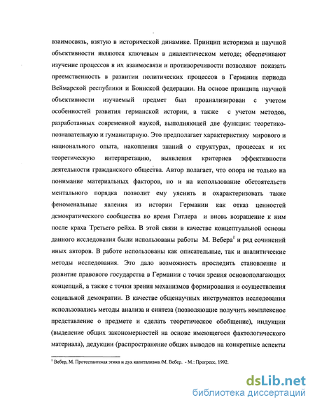 взаимосвязь, взятую в исторической динамике. Принцип историзма и научной объективности являются ключевым в диалектическом методе; обеспечивают изучение процессов в их взаимосвязи и противоречивости позволяют показать преемственность в развитии политических процессов в Германии периода Веймарской республики и Боннской федерации. На основе принципа научной объективности изучаемый предмет был проанализирован с учетом особенностей развития германской истории, а также с учетом методов, разработанных современной наукой, выполняющей две функции: теоретико-познавательную и гуманитарную. Это предполагает характеристику мирового и национального опыта, накопления знаний о структурах, процессах и их теоретическую интерпретацию, выявления критериев эффективности деятельности гражданского общества. Автор полагает, что опора не только на понимание материальных факторов, но и на использование обстоятельств ментального порядка позволит ему уяснить и охарактеризовать такие феноменальные явления из истории Германии как отказ ценностей демократического сообщества во время Гитлера и вновь возращение к ним после краха Третьего рейха. В этой связи в качестве концептуальной основы данного исследования были использованы работы М. Вебера1 и ряд сочинений иных авторов. В работе использованы как описательные, так и аналитические методы исследования. Это дало возможность проследить становление и развитие правового государства в Германии с точки зрения основополагающих концепций, а также с точки зрения механизмов формирования и осуществления социальной демократии. В качестве общенаучных инструментов исследования использовались методы анализа и синтеза (позволяющие получить комплексное представление о предмете и сделать теоретическое обобщение), индукции (выделение общих закономерностей на основе имеющегося фактологического материала), дедукции (распространение общих выводов на конкретные аспекты