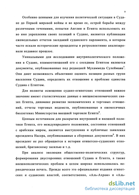 Источниками для раскрытия особенностей социально-экономической и внутриполитической жизни субрегиона, а также характера многосторонней деятельности представителей колониальной администрации в Судане и Египте служили рапорты генерал-губернаторов, советников, статистические публикации суданских и египетских финансовых и коммерческих ведомств1.