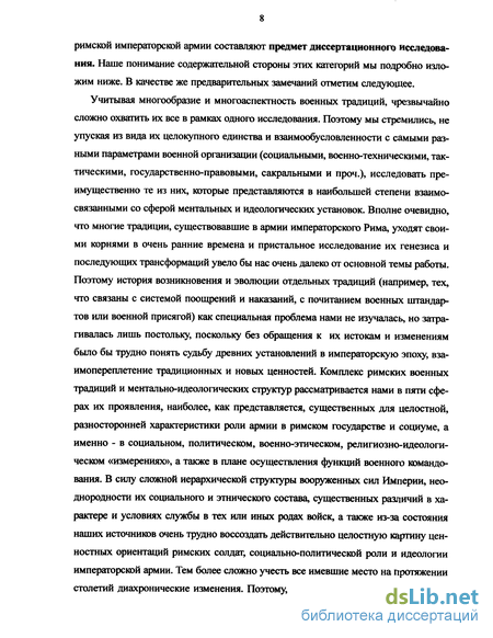 Учитывая многообразие и многоаспектность военных традиций, чрезвычайно сложно охватить их все в рамках одного исследования. Поэтому мы стремились, не упуская из вида их целокупного единства и взаимообусловленности с самыми разными параметрами военной организации (социальными, военно-техническими, тактическими, государственно-правовыми, сакральными и проч.), исследовать преимущественно те из них, которые представляются в наибольшей степени взаимосвязанными со сферой ментальных и идеологических установок. Вполне очевидно, что многие традиции, существовавшие в армии императорского Рима, уходят своими корнями в очень ранние времена и пристальное исследование их генезиса и последующих трансформаций увело бы нас очень далеко от основной темы работы. Поэтому история возникновения и эволюции отдельных традиций (например, тех, что связаны с системой поощрений и наказаний, с почитанием военных штандартов или военной присягой) как специальная проблема нами не изучалась, но затрагивалась лишь постольку, поскольку без обращения к их истокам и изменениям было бы трудно понять судьбу древних установлений в императорскую эпоху, взаимопереплетение традиционных и новых ценностей. Комплекс римских военных традиций и ментально-идеологических структур рассматривается нами в пяти сферах их проявления, наиболее, как представляется, существенных для целостной, разносторонней характеристики роли армии в римском государстве и социуме, а именно - в социальном, политическом, военно-этическом, религиозно-идеологическом «измерениях», а также в плане осуществления функций военного командования. В силу сложной иерархической структуры вооруженных сил Империи, неоднородности их социального и этнического состава, существенных различий в характере и условиях службы в тех или иных родах войск, а также из-за состояния наших источников очень трудно воссоздать действительно целостную картину ценностных ориентации римских солдат, социально-политической роли и идеологии императорской армии. Тем более сложно учесть все имевшие место на протяжении столетий диахронические изменения. Поэтому, учитывая по возможности все эти моменты и жертвуя частностями ради целого, основное внимание мы уделим общим, принципиальным и устойчивым характеристикам, которые отличали римского солдата и воинское сообщество в целом, но прежде всего его легионное ядро, составлявшее основу всех вооруженных сил и в наибольшей мере сохранявшее приверженность исконным традициям римского военного устройства и военной культуры. Акцент, таким образом, делается на синхронистическом освещении фундаментальных традиций, ценностных ориентации и идеологем, которые с большей или меньшей степенью устойчивости существовали в «большом времени».