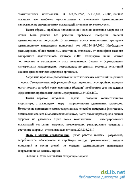 Таким образом, актуальна задача создания количественного индикатора, отражающего меру напряженности адаптивных процессов. Несмотря на применение самых современных способов измерения физических, химических свойств биологических объектов, найти такой параметр для оценки здоровья не удавалось. Идет поиск комплексных интегрированных показателей состояния здоровья, позволяющих ранжированно сравнивать состояние здоровья отдельных коллективов /225,235,241/.