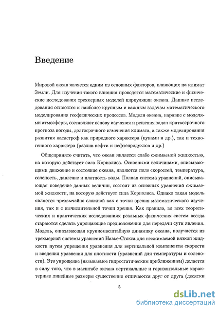 Актуальность темы. Мировой океан является одним из основных факторов, влияющих на климат Земли. Для изучения такого влияния проводятся математические и физические исследования трехмерных моделей циркуляции океана. Данные исследования относятся к наиболее крупным и важным задачам математического моделирования геофизических процессов. Модели океана, наравне с моделями атмосферы, составляют основу изучения и решения задач краткосрочного прогноза погоды, долгосрочного изменения климата, а также моделирования развития катастроф как природного характера (цунами и др.), так и техногенного характера (разлив нефти и нефтепродуктов и др.)