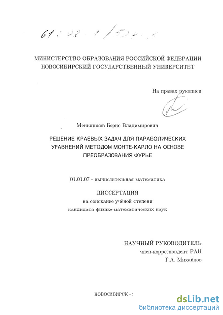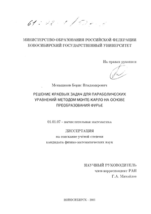 Меньщиков Борис Владимирович. Решение краевых задач для параболических уравнений методом Монте-Карло на основе преобразования Фурье : диссертация ... кандидата физико-математических наук : 01.01.07.- Новосибирск, 2001.- 99 с.: ил. РГБ ОД, 61 02-1/508-3