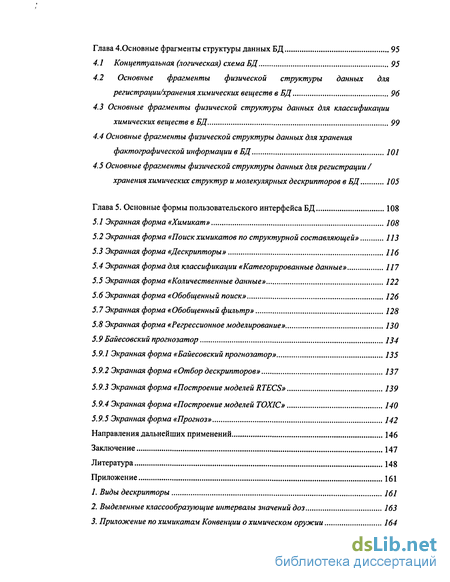 В четвертой главе диссертации дается описание концептуальной (логической) схемы БД, а также основных фрагментов физической структуры данных БД для решения задач регистрации, поиска, хранения и классификации химико-структурной информации (в том числе с помощью формул Маркуша) с указанием таблиц, их полей данных, а также связей между ними.