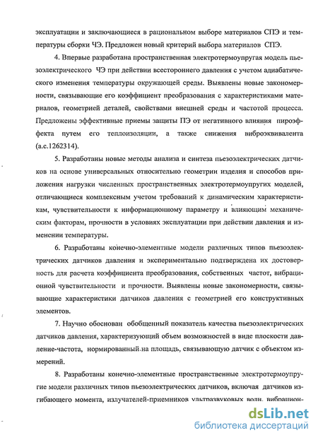 5. Разработаны новые методы анализа и синтеза пьезоэлектрических датчиков на основе универсальных относительно геометрии изделия и способов приложения нагрузки численных пространственных электротермоупругих моделей, отличающиеся комплексным учетом требований к динамическим характеристикам, чувствительности к информационному параметру и влияющим механическим факторам, прочности в условиях эксплуатации при действии давления и изменении температуры.