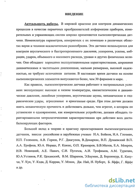 Большой вклад в теорию и практику проектирования пьезоэлектрических датчиков, внесли российские и зарубежные ученые Н.А. Бойков, И.А. Глозман, И.П. Голямина, А.В. Гориш, Р.Г. Джагупов, В.Домаркас, В.П. Дунаевский В.П. А.А. Ерофеев, Ю.А. Иориш, Р. Кажис, О.П. Крамаров, Б.В.Малов, Е.А. Мокров, И.В. Новицкий, А.Е. Панич, СИ. Пугачев, А.И. Трофимов, A.M. Туричин, Ю.А.Устинов, Р.К. Цеханский, В.М. Шарапов, Э.Бауман, Д. Берлинкур, Е. Кеку-чи, У. Кук, У. Кэди, Д. Керран, У. Мэзон, Дж. Най, Н. Нуберт, Б. Яффе, Г. Яффе и др. Вопросы проектирования датчиковой аппаратуры для специальных условий эксплуатации являются исключительно сложными. Имеется значительное число публикаций, в которых рассматриваются методы проектирования пьезоэлектрических датчиков, которые основываются, как правило, на одномерных моделях и ограничиваются нормальными условиями. В тех же случаях, когда требуется обеспечить работу датчика в заданном диапазоне температуры и давления, рекомендации имеют качественный характер, а принимаемые технические решения часто базируются только на опыте и интуиции разработчика и не являются оптимальными, особенно в тех случаях, когда требуется создание принципиально новых изделий. Поэтому требуемые технические или вообще не достигаются, или достигаются за счет снижения информативности или надежности приборов.