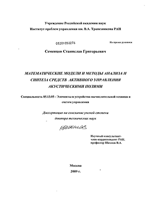 Семенцов Станислав Григорьевич. Математические модели и методы анализа и синтеза средств активного управления акустическими полями : диссертация ... доктора технических наук : 05.13.05 / Семенцов Станислав Григорьевич; [Место защиты: Ин-т проблем упр. им. В.А. Трапезникова РАН].- Москва, 2009.- 270 с.: ил. РГБ ОД, 71 10-5/340