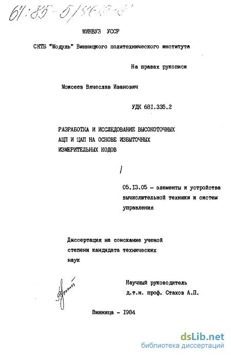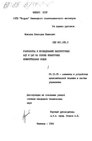 Однако вопросы, связанные с оптимизацией избыточного кодирования в АЦП и ЦАП, повышением эффективности способов поверки и коррекции инструментальных погрешностей высокоточных АЦП, а особенно ЦАП, а также вопросы преобразования информации из избыточного кода в двоичный и наоборот с целью согласования таких АЦП и ЦАП с двоичными устройствами цифровой вычислительной техники исследованы недостаточно.