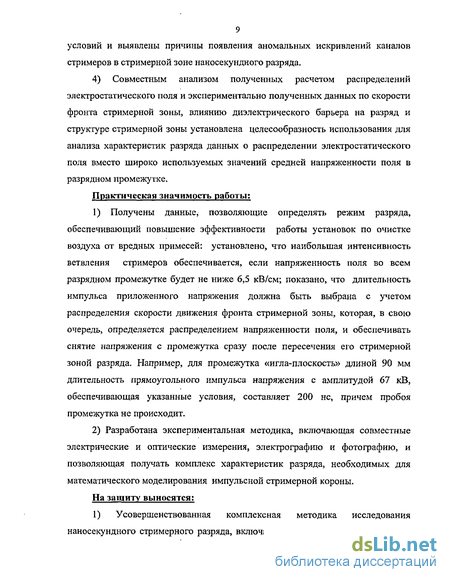 7 распределения электрического поля в разрядном промежутке) на структурные, электрические и оптические характеристики наносекундного стримерного разряда в электродных системах, характерных для технологических установок по очистке воздуха;