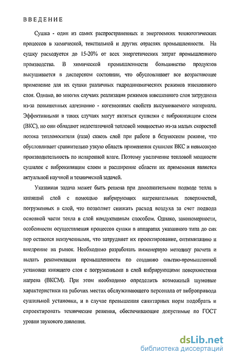 Сушка - один из самих распространенных и энергоемких технологических процессов в химической, текстильной и других отраслях промышленности. На сушку расходуется до 15-20% от всех энергетических затрат промышленного производства. В химической промышленности большинство продуктов высушивается в дисперсном состоянии, что обусловливает все возрастающее применение для их сушки различных гидродинамических режимов взвешенного слоя. Однако, во многих случаях реализация режимов взвешенного слоя затруднена из-за повышенных адгезионно - когезионных свойств высушиваемого материала. Эффективными в таких случаях могут являться сушилки с виброкипящим слоем (ВКС), но они обладают недостаточной тепловой мощностью из-за малых скоростей потока теплоносителя (газа) сквозь слой при работе в безуносном режиме, что обусловливает сравнительно узкую область применения сушилок ВКС и невысокую производительность по испаренной влаге. Поэтому увеличение тепловой мощности сушилок с виброкипящим слоем и расширение области их применения является актуальной научной и технической задачей.