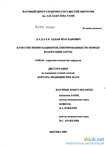 Положение, выносимое на защиту Положением, выносимым на защиту является то, что изучение качества жизни больных старшей возрастной группы после резекции коарктации аорты является необходимым условием для объективной оценки результатов лечения, и должно стать неотъемлемой частью клинического обследования пациентов. Реализация результатов работы Научные положения и практические рекомендации используются в практической работе отделения хирургического лечения артериальной патологии Научного Центра сердечно- сосудистой хирургии им. А. Н. Бакулева РАМН.