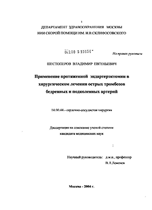 Шестоперов Владимир Евгеньевич. Применение протяженной эндартерэктомии в хирургическом лечении острых тромбозов бедренных и подколенных артерий : диссертация ... кандидата медицинских наук : 14.00.44 / Шестоперов Владимир Евгеньевич; [Место защиты: Российский кардиологический научно-производственный комплекс].- Москва, 2004.- 91 с.: ил.