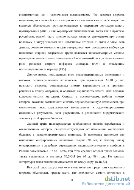 Сердечно-сосудистые заболевания стоят на первом месте среди причин смертности населения и, в особенности, у пациентов старших возрастных групп. В свою очередь современная кардиохирургия способна увеличить выживаемость и улучшить качество жизни таких больных. Однако здесь существует другая проблема, риск пери- и послеоперационных осложнений при выполнении таких операций с возрастом значительно увеличивается. В связи с этим хирургическое лечение больных пожилого возраста является весьма непростой задачей, решение которой еще далеко от своего завершения. В настоящее время по мере роста продолжительности жизни в развитых странах хирургическому лечению подвергается все больше пациентов преклонного и старческого возраста. Подобные тенденции прослеживаются и в России, что подкрепляется ростом количества исследований на данную тему. И если несколько десятилетий назад у пациентов старше 60лет обнаруживались существенные отличия по исходным и послеоперационным результатам, то в настоящее время рубеж, разделяющий пожилых и более молодых пациентов существенно изменился. На основе этого делается вывод о том, что возраст ни в коей мере не должен являться причиной для отказа от оперативного вмешательства. [2,28,34].