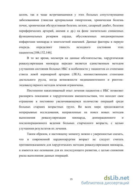 Тем не менее, в настоящее время общепринятой точкой зрения является то, что не возраст сам по себе является критерием для отбора пациентов для хирургического лечения многих ССЗ и, в частности, ИБС [43,71,114]. Так, Rich M.W. и соавт. после проведенного исследования пришли к выводу, что эффективность операций коронарного шунтирования и стентирования коронарных артерий у пожилых, сопоставима с таковой у более молодых пациентов. Делается вывод о том, что не возраст является препятствием к инвазивному лечению. Ограничение показаний к хирургическому лечению могут быть вызваны только сопутствующими заболеваниями, развивающимися на фоне старения организма [191]. Наиболее распространенные из них: мультифокальный атеросклероз (МФА), артериальная гипертензия (АГ), ожирение, сахарный диабет (СД), хроническая обструктивная болезнь легких (ХОБЛ), хроническая почечная недостаточность (ХПН).