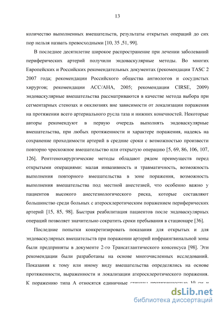 В последнее десятилетие широкое распространение при лечении заболеваний периферических артерий получили эндоваскулярные методы. Во многих Европейских и Российских рекомендательных документах (рекомендации TASC 2 2007 года; рекомендации Российского общества ангиологов и сосудистых хирургов; рекомендации ACC/AHA, 2005; рекомендации CIRSE, 2009) эндоваскулярные вмешательства рассматриваются в качестве метода выбора при сегментарных стенозах и окклюзиях вне зависимости от локализации поражения на протяжении всего артериального русла таза и нижних конечностей. Некоторые авторы рекомендуют в первую очередь выполнять эндоваскулярные вмешательства, при любых протяженности и характере поражения, надеясь на сохранение проходимости артерий в средние сроки с возможностью произвести повторно чрескожное вмешательство или открытую операцию [5, 69, 86, 106, 107, 126]. Рентгенохирургические методы обладают рядом преимуществ перед открытыми операциями: малая инвазивность и травматичность, возможность выполнения повторного вмешательства в зоне поражения, возможность выполнения вмешательства под местной анестезией, что особенно важно у пациентов высокого анестезиологического риска, которые составляют большинство среди больных с атеросклеротическим поражением периферических артерий [15, 85, 98]. Быстрая реабилитация пациентов после эндоваскулярных операций позволяет значительно сократить сроки пребывания в стационаре [36].