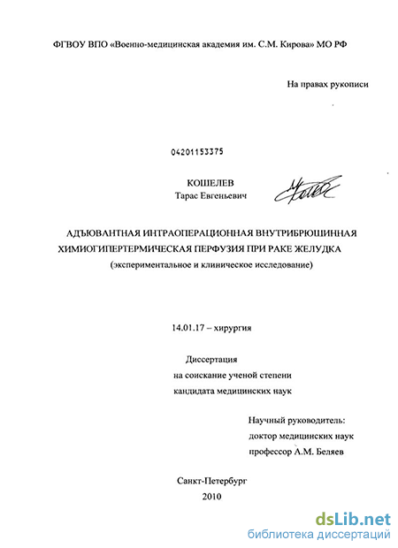 Личный вклад автора в проведенное исследование. Участие автора выразилось в определении идеи работы и планировании исследования. Автор выполнил ретроспективное исследование по историям болезни больных раком желудка, участвовал в экспериментальной части исследования, в хирургическом лечении большинства пациентов, включенных в исследование, в том числе в проведении адъювантной интраоперационной внутрибрюшин-
