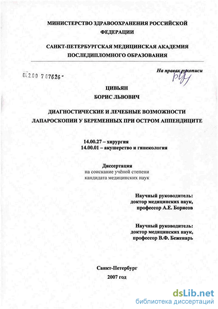 В современной литературе практически отсутствуют разработки по технике проведения диагностической лапароскопии и лапароскопической аппен-дэктомии у беременных на различных сроках гестации. Также, пока отсутствует ясность в отборе пациенток, выработке показаний и противопоказаний к этим вмешательствам у беременных [Fatum М., Rojansky N., 2001]. Необходимость разработки указанных вопросов и предопределило выполнение настоящей работы.