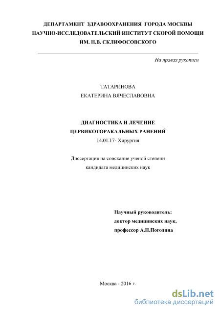 Автором диссертации проведен ретроспективный и проспективный анализ 123 пострадавших с цервикоторакальными ранениями. Создана база данных и проведена ее статистическая обработка.
