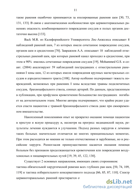 Back M.R. из Калифорнийского Университета Лос-Анжелеса описывает 8 наблюдений ранений шеи, 7 из которых имели сочетанное повреждение сосудов, органов шеи и средостения [70]. Завражнов А.А. описывает 18 наблюдений огнестрельных ранений шеи, при которых раневой канал проходил в средостение, при этом в 90% имелись сочетанные повреждения сосудов [19]. Mohammed G.S. и со-авт. (2004) анализируют 59 наблюдений пострадавших с огнестрельными ранениями I зоны шеи, 12 из которых имели повреждения крупных магистральных сосудов и аэродигестивного тракта [108]. Автор особенно подчеркивает тяжесть повреждений, возможных при ранениях I зоны вследствие травмы подключичных сосудов, брахиоцефального ствола, сонных артерий. По данным, представленным в публикации, при профузном кровотечении большинство пострадавших погибает на догоспитальном этапе. Многие авторы подчеркивают, что крайне редко удается спасти пациентов с травмой брахиоцефального ствола даже при своевременном вмешательстве.