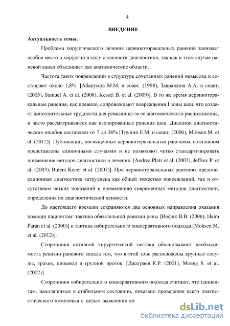 Публикации, посвященные цервикоторакальным ранениям, в основном представлены единичными случаями и не позволяют четко стандартизировать применение методов диагностики и лечения. [Andrea Platz et al. (2003), Jeffrey P. et al. (2003), Bulent Kocer et al. (2007)].