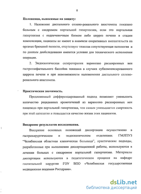 Внедрение основных положений диссертации осуществлено в гастрохирургическом и эндоскопическом отделениях ГМЛПУЗ "Челябинская областная клиническая больница", практические подходы, разработанные при выполнении диссертационной работы, используются в лечении больных с синдромом портальной гипертензии. Материалы диссертации используются в педагогическом процессе на кафедре госпитальной хирургии ГОУ ВПО «Челябинская государственная медицинская академия Росздрава».