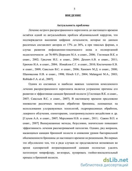 Лечение острого распространенного перитонита до настоящего времени остаётся одной из актуальнейших проблем абдоминальной хирургии, что подтверждается высокими цифрами летальности, составляющим по данным разных авторов от 18 до 60%. (Косовских А.А. и соавт., 2012; Савельев В.С. и соавт., 2007; Сандаков П.Я. и соавт., 2008; Яковлев С.В. и соавт., 2007; Holzheimer R.G., 2003; Paterson H.M. et al., 2008). Одним из составных и наиболее важных элементов комплексного лечения распространенного перитонита является устранение причины развития перитонита и эффективная санация брюшной полости. К настоящему времени предложено множество различных методов обработки брюшины, основанных на использовании ультразвуковых технологий, гидропрессивных обработок, озонотерапии, лазерного облучения, электроимпульсного воздействия и др. Вышеуказанные методы, безусловно, значительно повысили эффективность лечения рассматриваемой патологии. Однако ряд вопросов, касающихся санации брюшной полости и снижения уровня бактериального обсеменения брюшины, остаются до настоящего времени не решенными. Сказанное, с одной стороны, обусловлено тем, что в ряде случаев не представляется возможным во время однократной интраоперационной санации полностью удалить патогенную микрофлору, с другой – купировать гнойно-воспалительный процесс в брюшной полости.