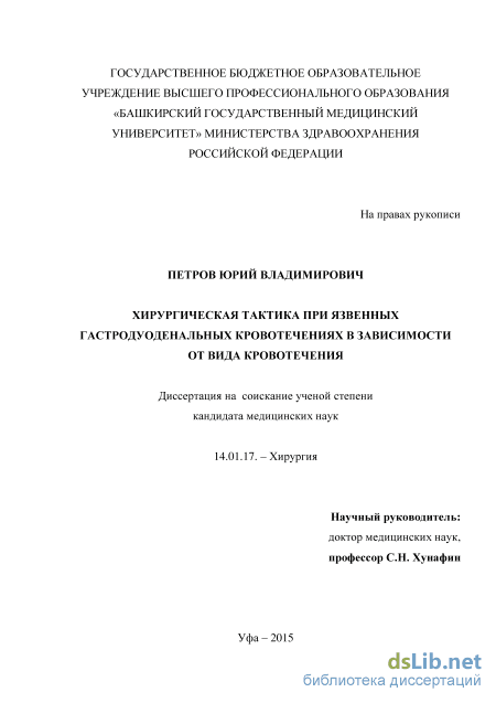 Публикация результатов исследований. Опубликовано 15 научных работ, в том числе 4 в рецензируемом журнале ВАК, получен 1 патент РФ на изобретение № 2407445 от 27.10.2010 г. «Способ выбора тактики лечения острых гастродуоде-нальных кровотечений».
