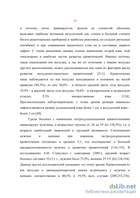 Прогностическим неблагоприятным, с точки зрения размера язвенного дефекта является размер дуоденальной язвы более 1 см, а желудочной язвы -более 2 см [44]. Среди больных с язвенными гастродуоденальными кровотечениями превалируют мужчины, в возрастных группах от 20 до 59 лет (58,3%), т.е. в возрасте наибольшей творческой и трудовой активности. Соотношение мужчин и женщин при язвенном гастродуоденальном кровотечении составляет в среднем 3:1, что подтверждает о большей предрасположенности мужчин к развитию кровотечений [134,135], В исследованиях А.И. Станулиса с соавторами (2001), средний возраст больных составил 52±3,1 г., мужчин было 72,9%, женщин 27,1% [62,124,154]. Данные других исследователей указывают эту точку зрения. Кровотечения из язв желудка и двенадцатиперстной кишки встречались у мужчин и женщин соответственно в 80,5% и 19,5% всех случаев [209,253,276]. Распределение по возрасту было следующим: до 30 лет - 7,9%, 30-39 лет -23,6%, 40-49 лет - 24,8%, 50 - 59 лет -24,4%, 60 лет и старше -19,3% [84,261,270].
