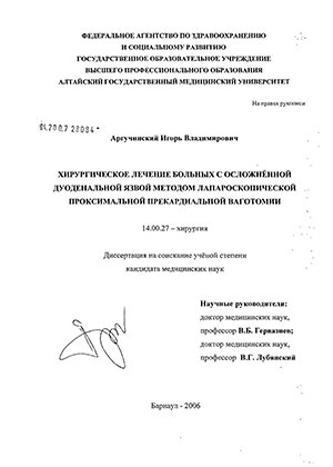 Аргучинский Игорь Владимирович. Хирургическое лечение больных с осложненной дуоденальной язвой методом лапароскопической проксимальной прекардиальной ваготомии : диссертация ... кандидата медицинских наук : 14.00.27 / Аргучинский Игорь Владимирович; [Место защиты: ГОУВПО "Алтайский государственный медицинский университет"].- Барнаул, 2006.- 159 с.: ил.