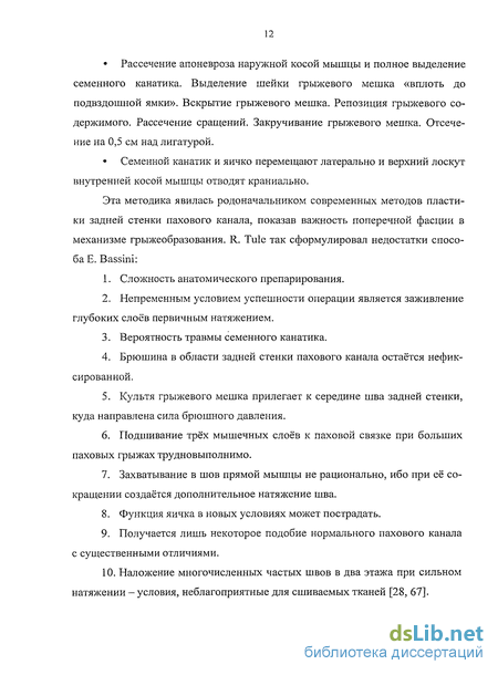 Паховая грыжа является одним из самых распространённых хирургических заболеваний. Среди всех наружных брюшных грыж она составляет 70-80% [1,25, 71,72, 141]. С.С. Юдин писал «... во врачебном искусстве, особенно же в хирургии, натурой является анатомический субстрат и физиологическая функция человека. И задачей хирургов при любых научных поисках всегда было, и будет внимательно и осмысленно подражать природе» [67, 51]. Физиологическая функция стенок пахового канала заключается в сложном защитном механизме рефлекторной деятельности мышечных и су-хожильно-апоневротических образований стенок канала и его отверстий, возникающей при напряжении брюшного пресса и оказывающей сопротивление внутрибрюшному давлению. Защитная деятельность стенок пахового канала изучалась многими авторами [46, 54, 55, 161, 197] и представлена следующим образом. При повышении внутрибрюшного давления рефлекторно происходит напряжение мышц брюшного пресса, и начинают действовать 5 защитных механизмов пахового канала: 1. При напряжении прямых мышц живота уменьшается высота пахового промежутка, нижний край поперечной и внутренней косой мышц приближается к паховой связке, перекрывая своими сухожилиями заднюю стенку пахового канала. 2. При сокращении внутренней косой и поперечной мышц живота ими перекрывается внутреннее паховое кольцо пахового канала, который приобретает более косое направление. 3. Внутрибрюшные органы создают давление на заднюю стенку пахового канала, прижимая её к передней. При этом он несколько суживается и уплотняется, препятствуя формированию грыжевого мешка. 4. Мышца, поднимающая яичко, при сокращении подтягивает СК вверх и подобно пробке перекрывает паховый канал. 5. Наружная косая мышца живота при сокращении несколько подтягивает вверх пупартову связку, уменьшая размеры пахового промежутка и наружного кольца пахового канала. Указанные анатомо-физиологические особенности пахового канала должны учитываться при операциях в данной области. Все применяемые ранее и сейчас виды пластик грыжевого канала по доступу и способу выполнения можно объединить в несколько основных групп [67, 28]. 1. «Передние натяжные» способы пластики. 2. «Задние натяжные» способы пластики. 3. «Ненатяжные» ауто- и аллопластические способы. 4. Видеоассистированные методики. 5. Лапароскопические методики. Натяжная герниопластика История лечения паховых грыж с пластикой задней стенки начинается с 1884 года. Первая операция была выполнена Е. Bassini, о своем опыте он сообщил в публикациях 1887 года, где были представлены три наиболее ценных положения его операции: Разрез кожи. Обнажение апоневроза наружной косой мышцы и наружного пахового кольца. Рассечение апоневроза наружной косой мышцы и полное выделение семенного канатика. Выделение шейки грыжевого мешка «вплоть до подвздошной ямки». Вскрытие грыжевого мешка. Репозиция грыжевого содержимого. Рассечение сращений. Закручивание грыжевого мешка. Отсечение на 0,5 см над лигатурой. Семенной канатик и яичко перемещают латерально и верхний лоскут внутренней косой мышцы отводят краниально. Эта методика явилась родоначальником современных методов пластики задней стенки пахового канала, показав важность поперечной фасции в механизме грыжеобразования. R. Tule так сформулировал недостатки способа Е. Bassini: 1. Сложность анатомического пре