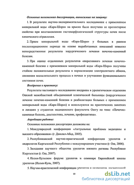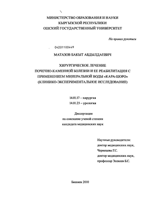 Матазов, Бакыт Абдылдаевич. Хирургическое лечение почечно-каменной болезни и ее реабилитация с прменением минеральной воды "Кара-Шоро" (клинико-экспериментальное исследование) : диссертация ... кандидата медицинских наук : 14.01.17 / Матазов Бакыт Абдылдаевич; [Место защиты: Государственное образовательное учреждение высшего профессионального образования Кыргызско-Российский славянский университет].- Бишкек, 2012.- 96 с.: ил.