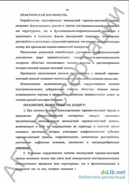 Разработанная классификация последствии черепно-мозговой травмы, позволяет формулировать диагноз с учетом посттравматических нарушений как структурного, так и функционально-неврологического характера с выделением в отдельные формы последствий эпилепсии, психических расстройств и длительных нарушений сознания, что создает дополнительную основу для проведения медико-социальной экспертизы.