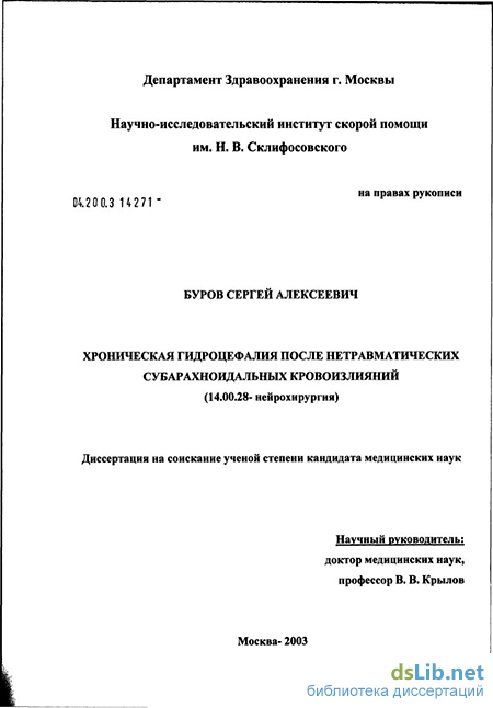 Буров Сергей Алексеевич. Хроническая гидроцефалия после нетравматических субарахноидальных кровоизлияний : диссертация ... кандидата медицинских наук : 14.00.28 / Буров Сергей Алексеевич; [Место защиты: Научно-исследовательский институт скорой помощи].- Москва, 2003.- 135 с.: ил.