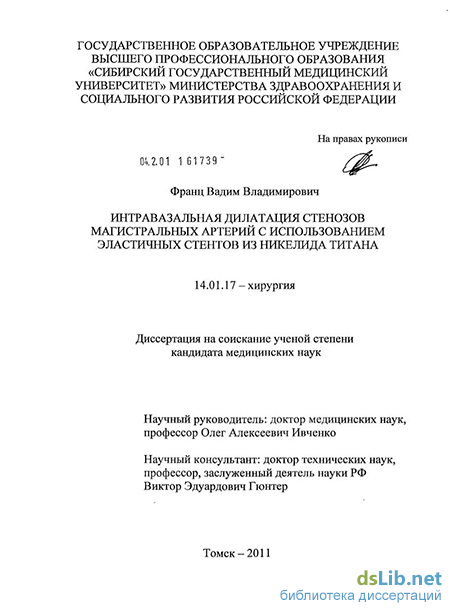 Материалы диссертации доложены и обсуждены на 18-ой (XXII) Международной конференции Российского общества ангиологов и сосудистых хирургов «Внедрение высоких технологий в сосудистую хирургию и флебологию» (Новосибирск, 2007), на 15-ом Всероссийском съезде сердечно-сосудистых хирургов (Москва, 2009), на заседании Томского областного регионального отделения Российского общества хирургов (Томск, 2010), на Международной конференции «Shape memory biomaterials and implants» (Томск, 2010), на 22-й (XXVI) Международной конференции Российского общества ангиологов и