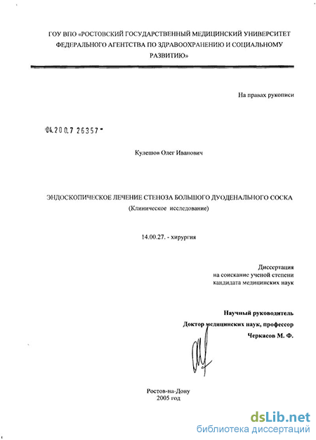 Кулешов Олег Иванович. Эндоскопическое лечение стеноза большого дуоденального соска : диссертация ... кандидата медицинских наук : 14.00.27 / Кулешов Олег Иванович; [Место защиты: ГОУВПО "Ростовский государственный медицинский университет"].- Ростов-на-Дону, 2005.- 116 с.: ил.