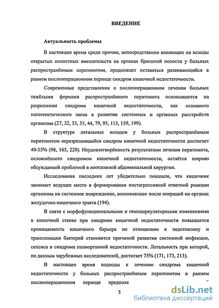 В структуре летальных исходов у больных распространённым перитонитом неразрешившийся синдром кишечной недостаточности достигает 40-55% (98, 165, 220). Неудовлетворённость результатами лечения перитонита, осложнённого синдромом кишечной недостаточности, остаётся широко обсуждаемой проблемой в неотложной абдоминальной хирургии.