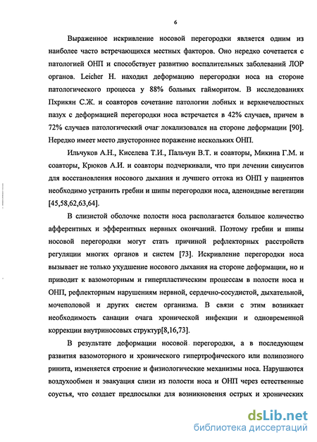 В слизистой оболочке полости носа располагается большое количество афферентных и эфферентных нервных окончаний. Поэтому гребни и шипы носовой перегородки могут стать причиной рефлекторных расстройств регуляции многих органов и систем [73]. Искривление перегородки носа вызывает не только ухудшение носового дыхания на стороне деформации, но и приводит к вазомоторным и гиперпластическим процессам в полости носа и ОНП, рефлекторным нарушениям нервной, сердечно-сосудистой, дыхательной, мочеполовой и других систем организма. В связи с этим возникает необходимость санации очага хронической инфекции и одновременной коррекции внутриносовых структур[8,16,73].